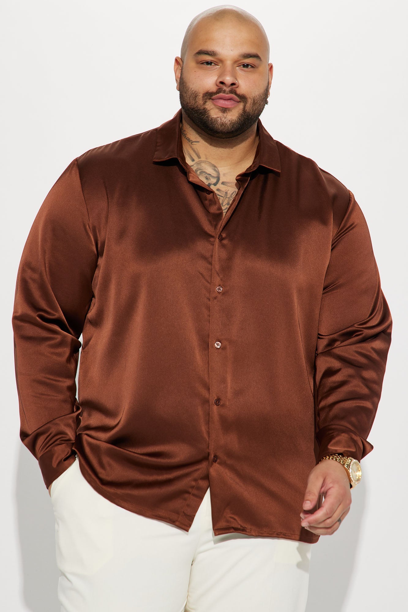 Links Satin Long Sleeve Button Up Shirt - Chocolate